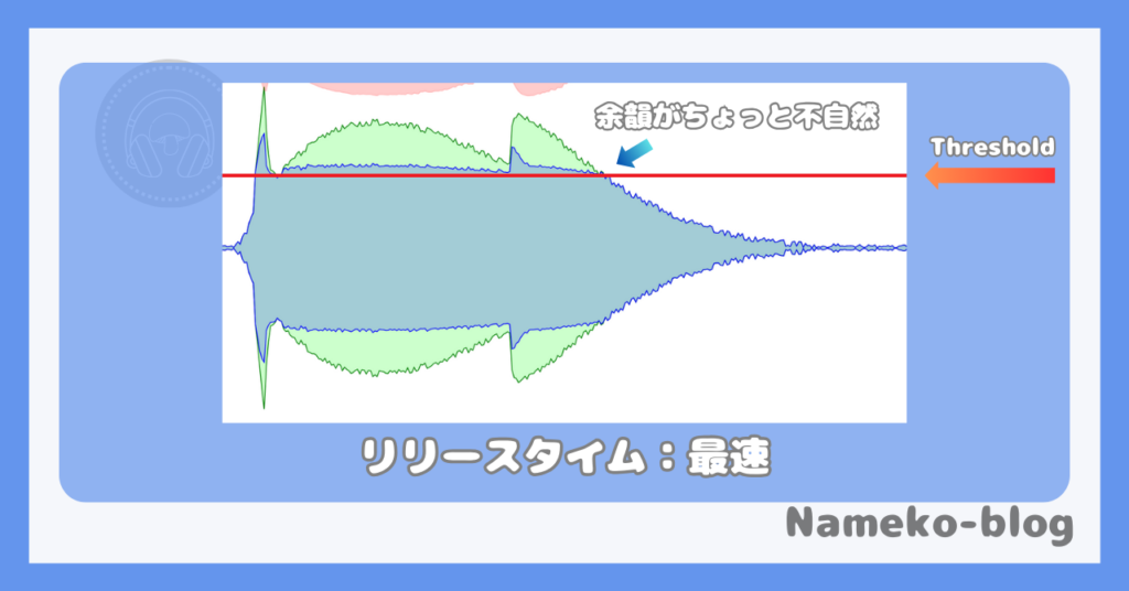 Threshold(赤い線)を下回った時にComp(圧縮)を急にオフにすると、音量が少しずつ下がるはずの音の余韻が不自然に大きく聞こえてしまいます。